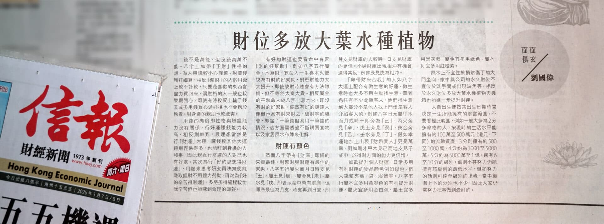 Kevin Lau 劉國偉,香港著名風水命理顧問,師承人稱現代賴布衣蘇民峰師傅等。專業風水、八字運程 (算命)、改名、擇日服務。Kevin 多年來於香港信報【面面俱玄】專欄撰寫文章,亦擔任多間中外機構、媒體與非牟利團體的風水命理顧問,如香港旅遊發展局、的近律師行 (DEACONS)、香港寶嘉建築(Dragages)、星展銀行 (DBS)、香港動物基金會、Groupon HK、台灣中時電子報、香港免費報章 am730、香港國際青年商會(JCI荃灣)、美國萬通保險 (MassMutual)、友邦保險 (AIA)、香港蘋果日報等。曾受訪的中外媒體機構如南美最大電視台 Rede Globo、台灣民視電視台、台灣自由時報、台灣 Now News、台灣三立電視台、台灣TVBS、香港東方日報、香港太陽報、英文媒體 Localiiz、香港大學、香港浸會大學等。[詳細]